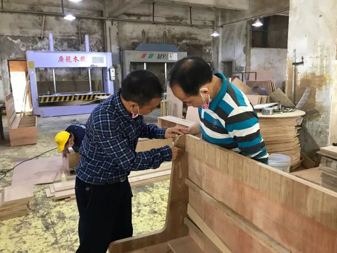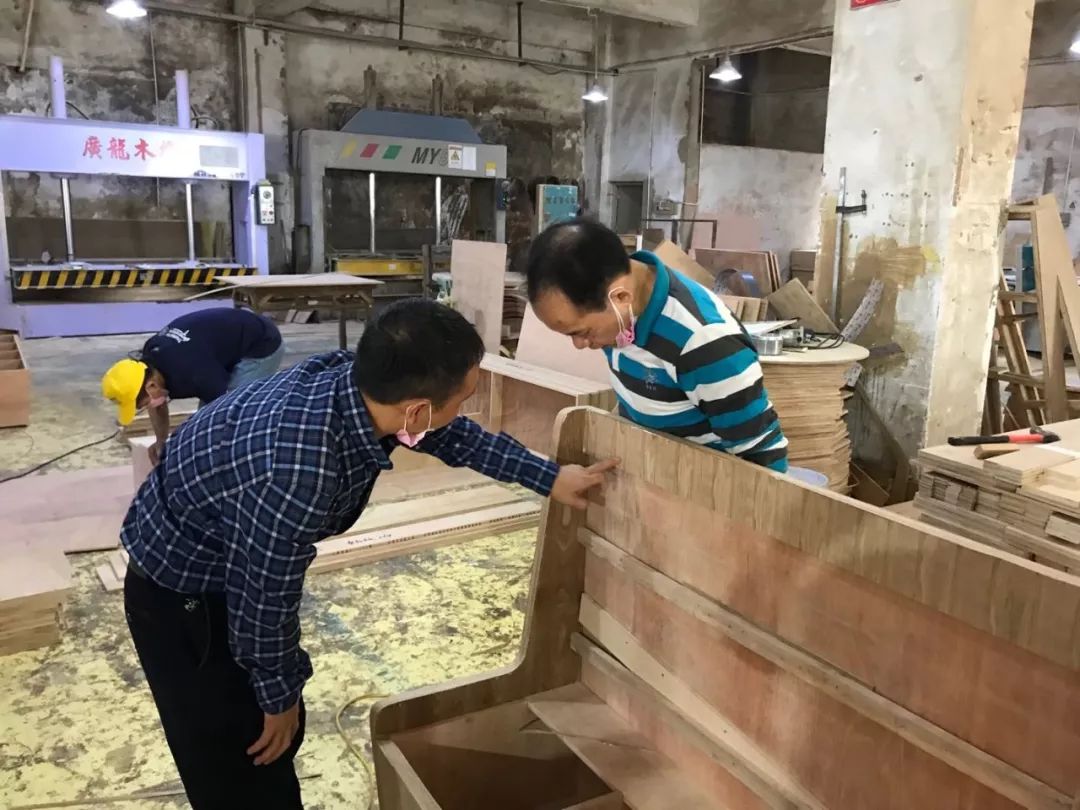 卡座侧板与靠背板颜色存在色差,被总经理检查时发现,要求师傅兄弟即修复。车间生产现场,师傅兄弟们积极投入生产,热情高涨,总经理谷先生抑制