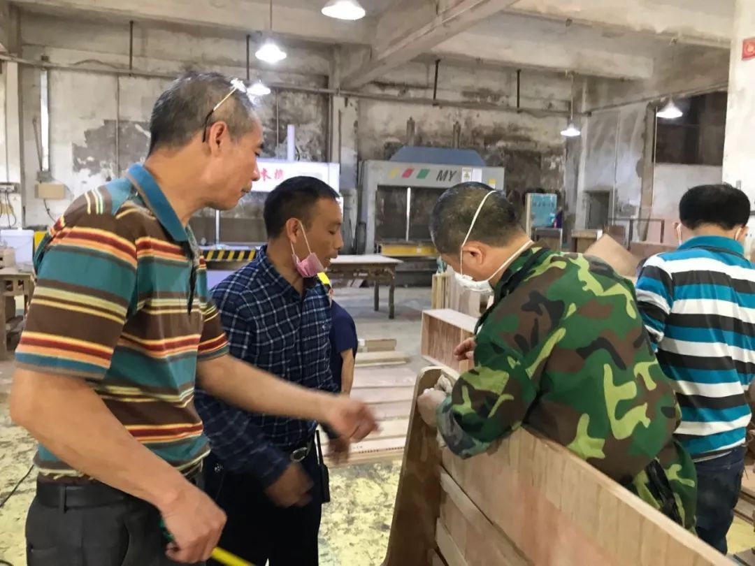 沙发部的木工兄弟陈师傅讲解自己的生产工艺,厂长和总经理都认真倾听,并给出自己的建议,希望陈师傅能生产出高质量的沙发。