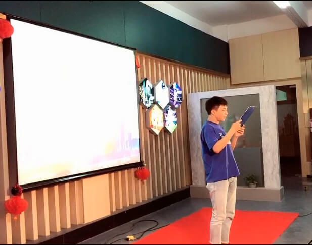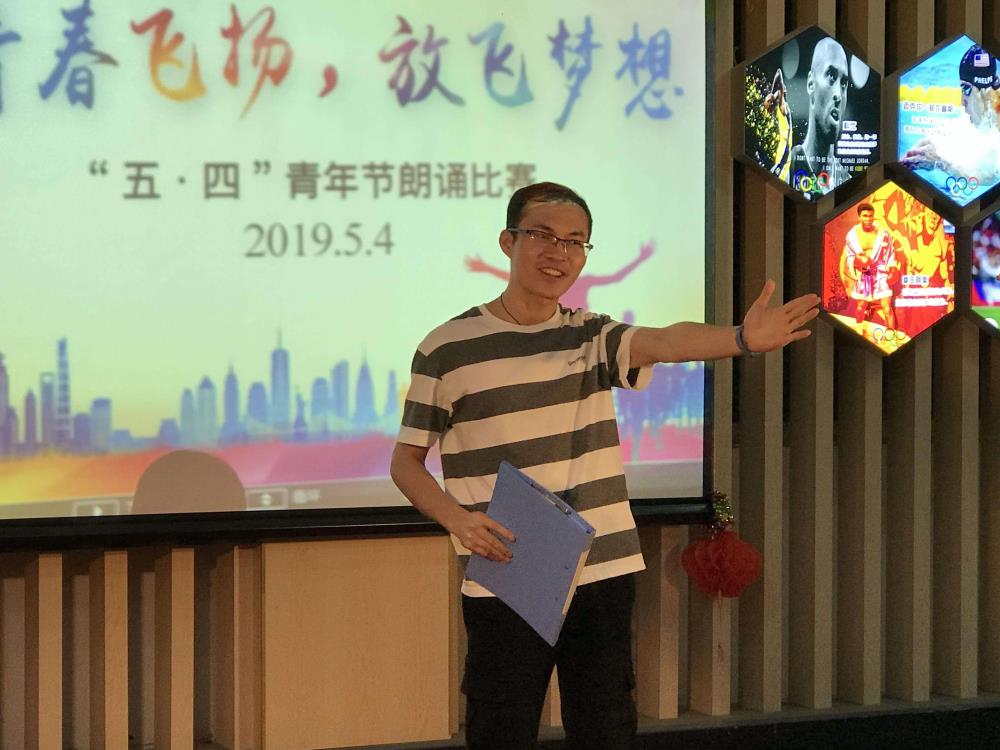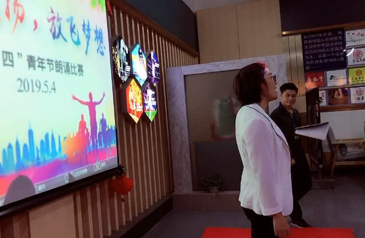 2019年5月4日。19:00一切准备就绪,精彩的朗读比赛在欢快激昂的音乐声中开幕了!一段运动进行曲,把全场的气氛瞬间活跃了起来。选手们个个摩拳擦掌,跃跃欲试。主持人开场后由公司最高层领导致辞,并宣布比赛开始。并进入第一个环节。23组选手纷纷抽签按顺序准备上台表演。第一位出场的朗读者是谷树平,演讲内容积极向上、声音洪亮、娓娓动听、引人入胜,拉开了朗读赛的序幕。伴随着阵阵的掌声的起落,很快轮到了五号选手。谭冰冰上台演讲了,只闻一段振奋人心的背景音乐一响起,便把朗读演讲的气势带上了较高的一个层次,同时配上抑扬顿挫、高亢激昂的演讲声赢得了评委及观众的阵阵掌声。接下来的六号选手朱运强以及十号选手梁伟海,同样用振振有词、激奋人心的演讲打动了评委和观众,让高潮迭起,一浪高一浪,同样赢得了现场评委和观众的阵阵掌声。最后在23号双人选手,吴素漫和邓绍云的中英双语,完美结合的朗读声中结束了。