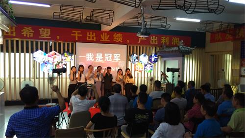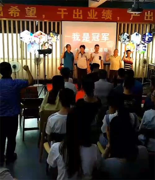 最后一个接受表彰的是车间木工部的新任主管王福小伙伴,虽然个子不大,但做事态度很积极,勤奋务实,接地气,为大家树立好榜样,接受表彰当之无愧。接下来是业务部经理符红兵,对部门业绩仅个人业绩进行总结并分享了自己的成果与成功历程。只要朝着自己的 努力拼搏,相信一切皆有可能。最后是表达各个部门努力拼搏干业绩的决心;都由各部门负责人做代表上台进行宣誓表决“只要相信,我就是冠军,我一定能成为冠军!”表彰大会完满结束!