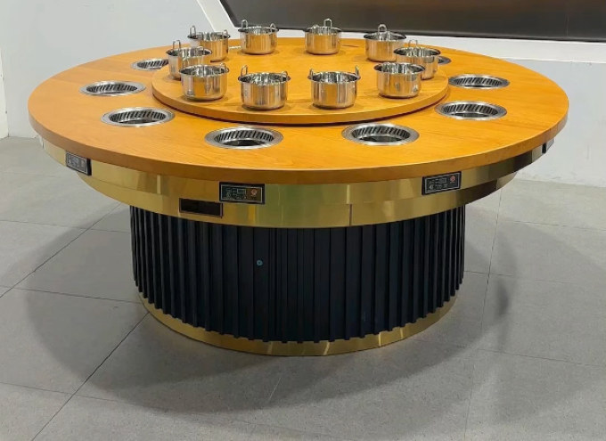 海德利火锅家具为您提供10人位一人一位无烟净化小火锅桌图片展示价格说明定做服务。10人位一人一锅无烟净化小火锅桌是一款为多人聚餐设计的创新餐桌,直径2米,适合10人同时使用。每个座位都配有独立的小火锅,并内置无烟净化功能,有效消除油烟和异味,保持用餐环境的清新,无需安装排烟管道,使用方便。 这款火锅桌采用白蜡木材质,桌面展现出自然的木纹和温润的色调,既美观又实用。桌面具备耐高温、耐磨、耐刮等特点,经久耐用。每个座位配备了电磁炉或电陶炉,食客可以根据个人喜好调节火力,提供个性化的用餐体验。 无烟净化小火锅桌不仅适合家庭聚会,还非常适合餐厅、酒店等商业场所,既提升了用餐体验,又具备便利性和环保性。